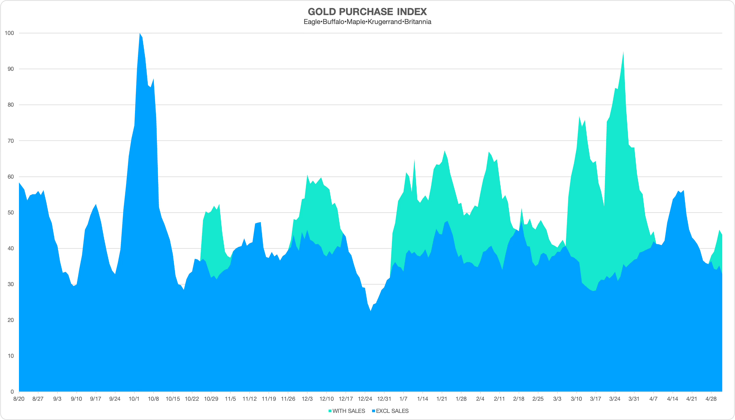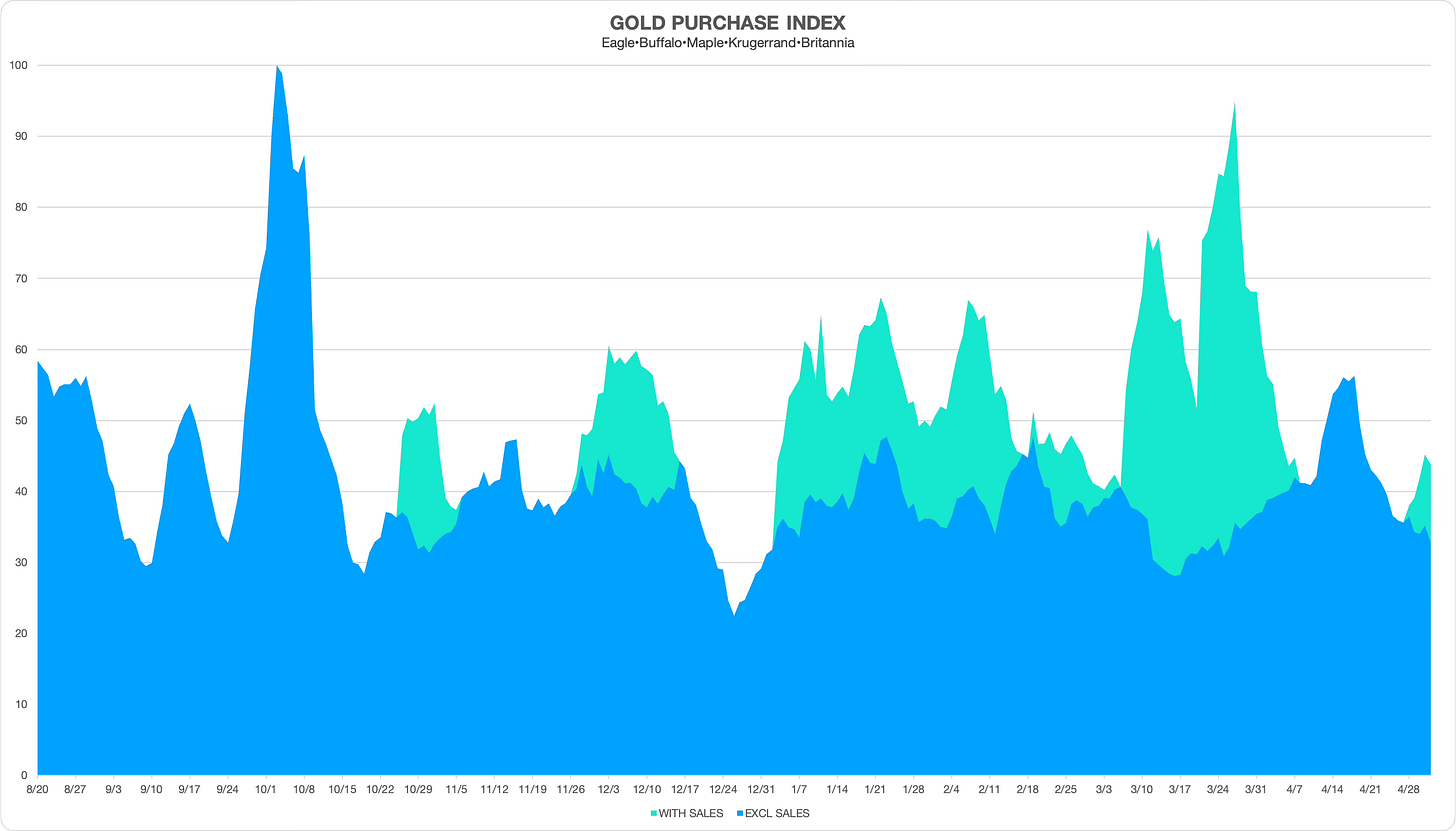There were only a few deals (green shade) in the gold coins over the week, nothing significant. Buyers of physical gold bullion continue to pull back (blue shade).