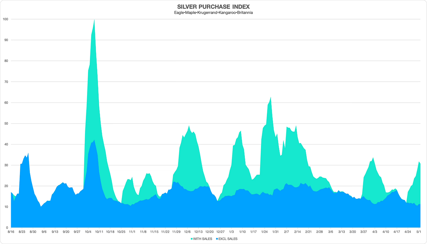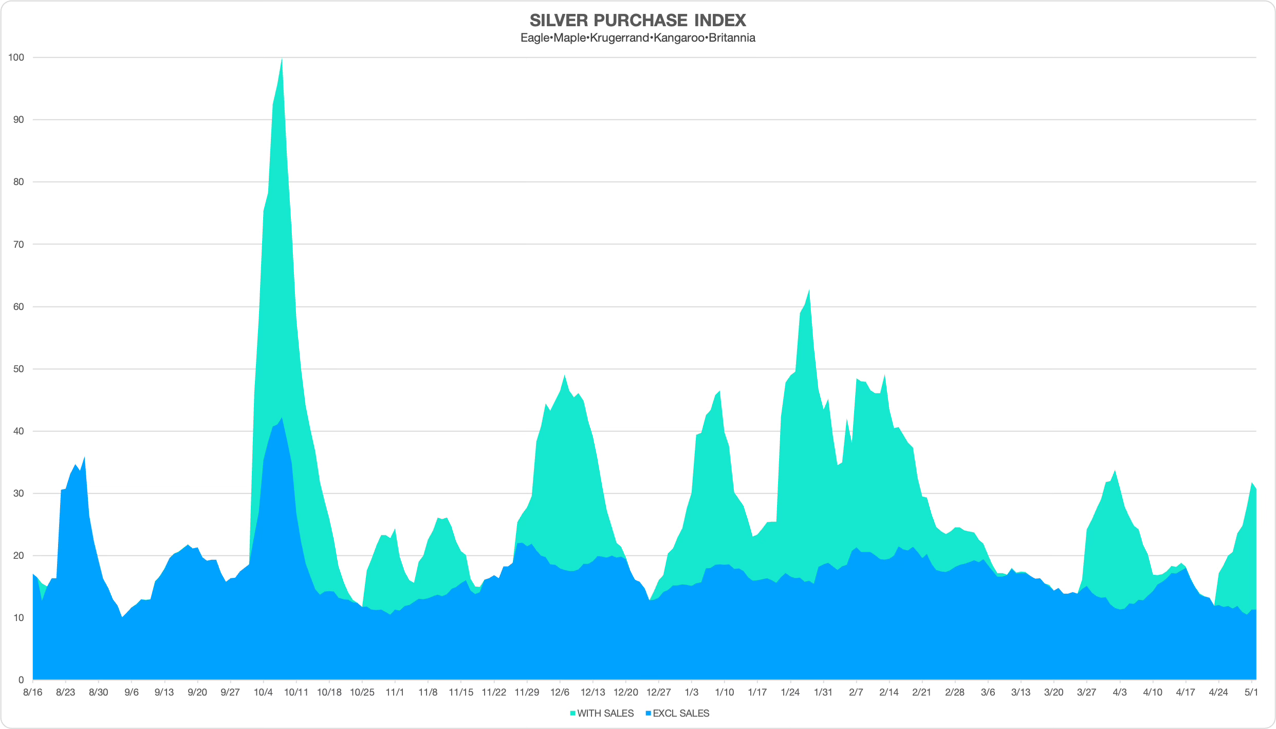 Regular-price (blue shade) silver bullion volume has slowed significantly from February volume. Buyers are still not willing to chase physical silver prices higher.